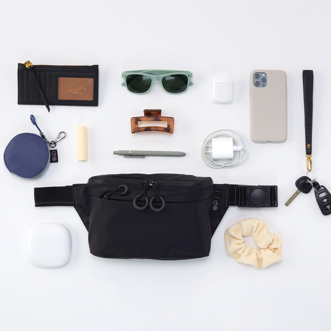 RQ: Real quick. sling on this belt bag and slay those days when your hands are full but your to-do list is fuller. Made of lightweight. durable nylon. it’s your wallet. work pouch and travel pal-your all-in-one compact companion. Snacks? Keys? Puppy treats? Check. check. and oh-so-stylish. check.