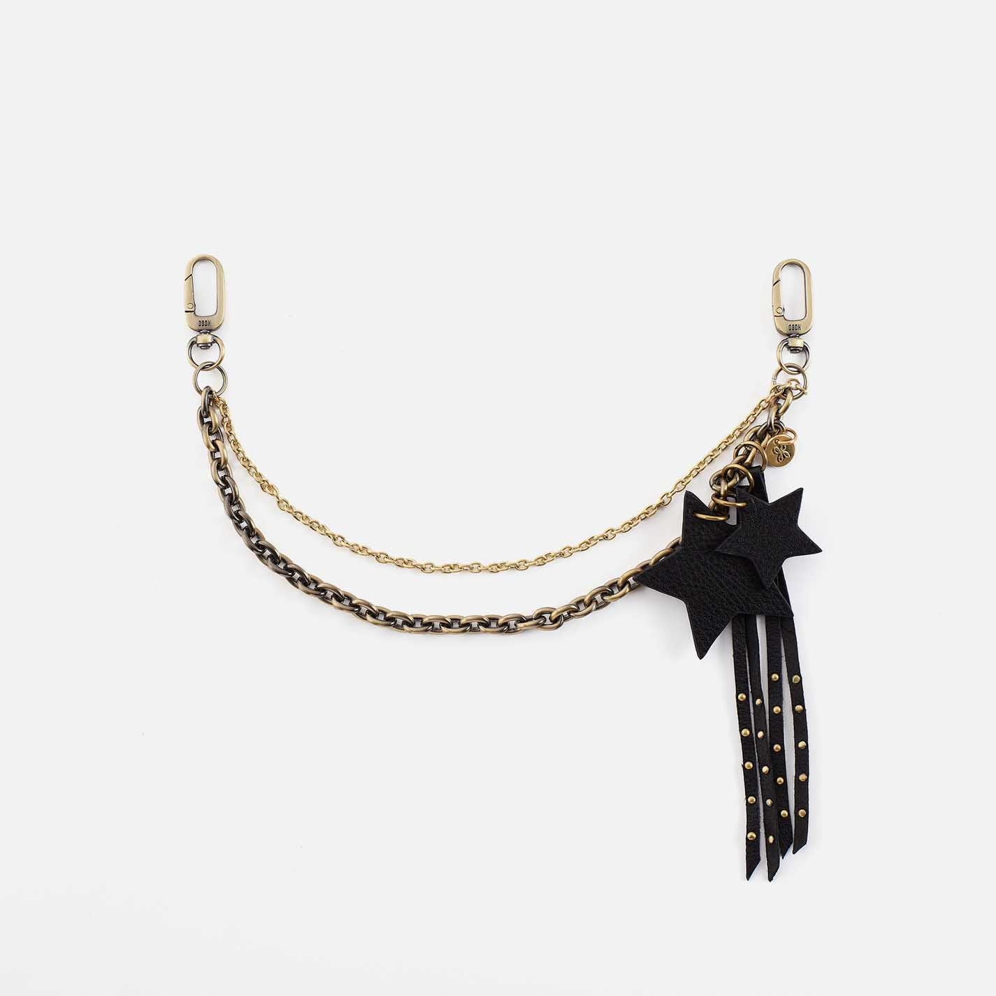 Edge meets elegance with this double-chain leather swag. Featuring two black leather stars and studded fringe. it clips to both sides of your bag for a bold. rebellious vibe.